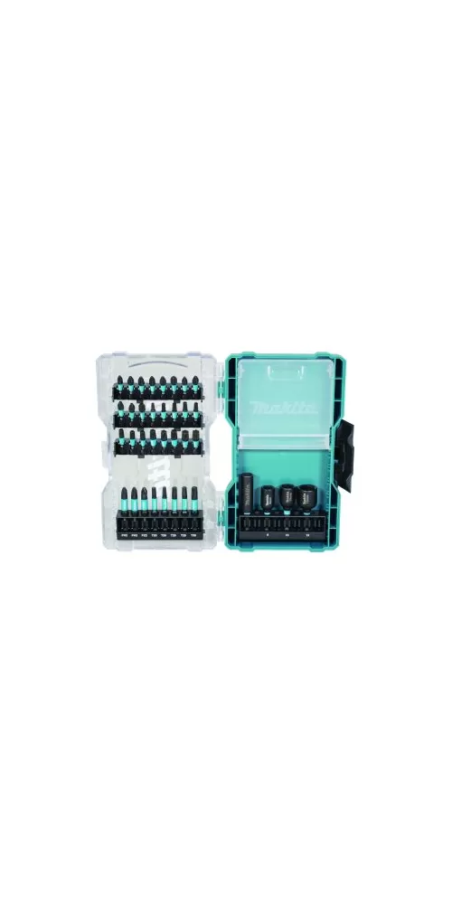 Sada torzních bitů IMPACT BLACK obsahuje bity 25 mm PH1, 4x PH2, PH3, PZ1, 3x PZ2, PZ3, T15, 3x T20, 3x T25, 3x T30, 2x T40, bity 50 mm 2x PH2, PZ2, 2x T20, 2x T25, T30, nástrčné klíče 8, 10 a 13 mm, držák bitů 60 mm. Sada je dodávaná v plastové krabičce.